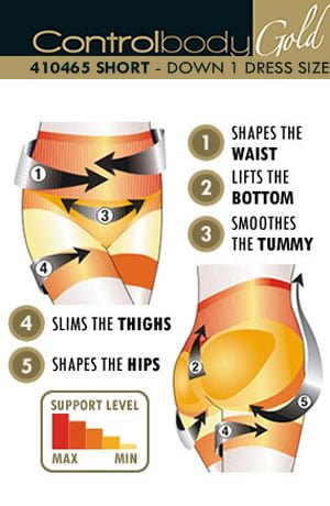 This is a Stock Line productShaping short with high compression providing a firm level of support. Soft microfiber and silicon on the waist. Jacquard panelled and scalloped edge. Shapes the waist lifts the bottom shapes the hips slims the thighs and smooth the tummy. Anti-bacterial gusset. Item comes packaged in a Control Body box.