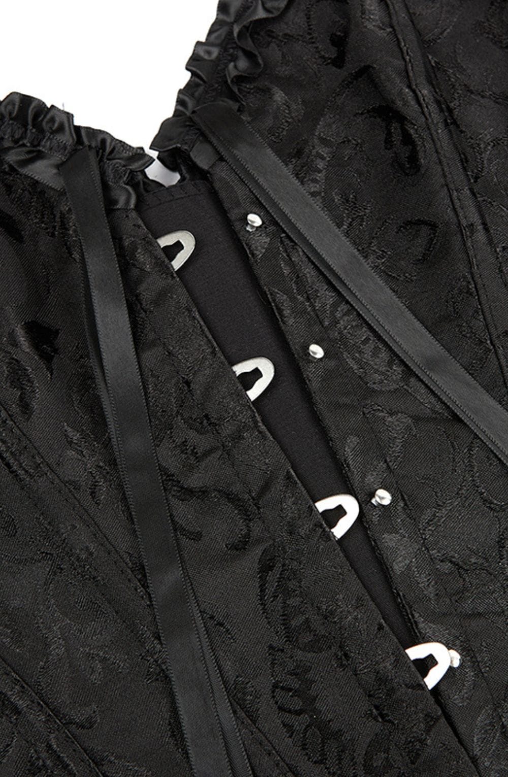 Turn heads and accentuate your silhouette with this stunning black brocade corset. Designed with a vintage-inspired floral pattern, this waist-cinching piece combines timeless elegance with modern structure. The sweetheart neckline is beautifully framed by satin ruffle trim and a centre bow, adding a touch of romance and sophistication.